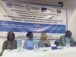 The Officer-In-Charge of the International Organization for Migration (IOM) Sierra Leone, Madame Pauline Macharia, said Sierra Leone’s commitment is “not only to report but also to demonstrate practical solutions, shared good practices, and sustain the momentum to translate global commitment into national outcome.” She noted that the review came at a critical time as the world prepares to demonstrate its commitment on the global stage in New York later this year. She reiterated that the report validated at the session would represent Sierra Leone internationally. She closed by reaffirming IOM’s commitment to continue supporting the Government of Sierra Leone.